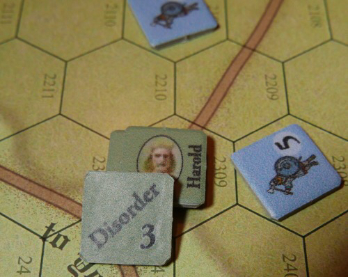 Orri already had three units permanently disordered, so he decided to launch his berserker attack this turn, even though the situation would not allow him to maximise that benefit. The attacks got him closer to Harold, but at this late stage, it looked like Harold and the crossing would remain safe.