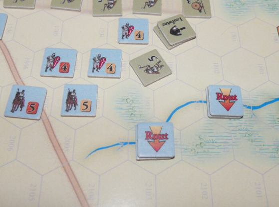 Having said that, the Norman penetration on the left flank had also brought them adjacent to the hexrow that would have given them similar victory points for unhinging the defensive position. So all in all a shorter game than usual, but one that had plenty of the characteristic suspense of going down to the wire.