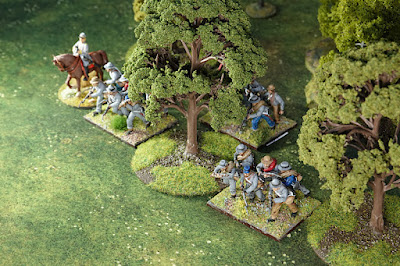 The table is set up as per the map, but there is no real need to represent the waterway on the table (I didn't). The 3rd Connecticut and 5th Virginia will start within smoothbore musket range of each other and would still be in range (maximum) if 3rd CT dropped back behind the fence. Keyes sets up 1” away from 2nd ME and Jackson sets up 1” away from 5th VA.